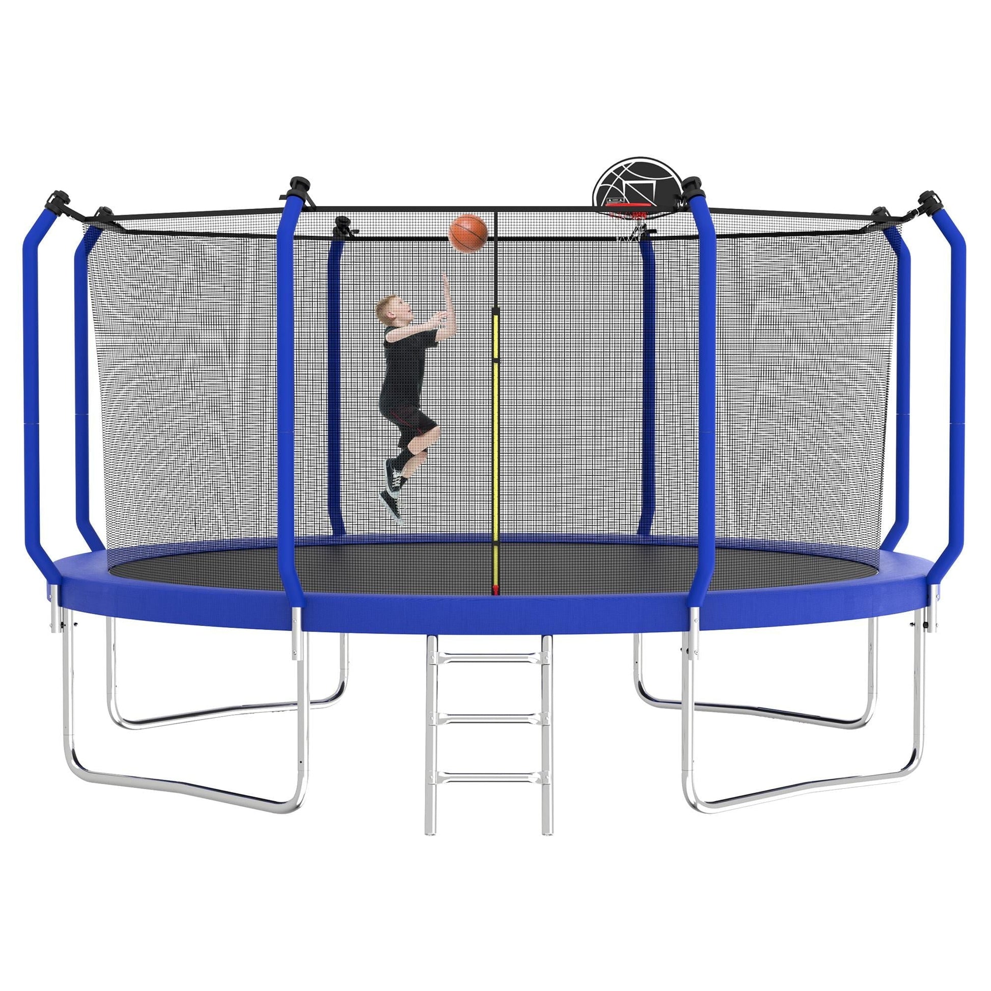 14FT Trampoline with Enclosure, Kids Trampoline with Basketball Hoop and Non-slip Ladder, Backyard Patio Family Outdoor Recreational Trampoline, Including All Accessories