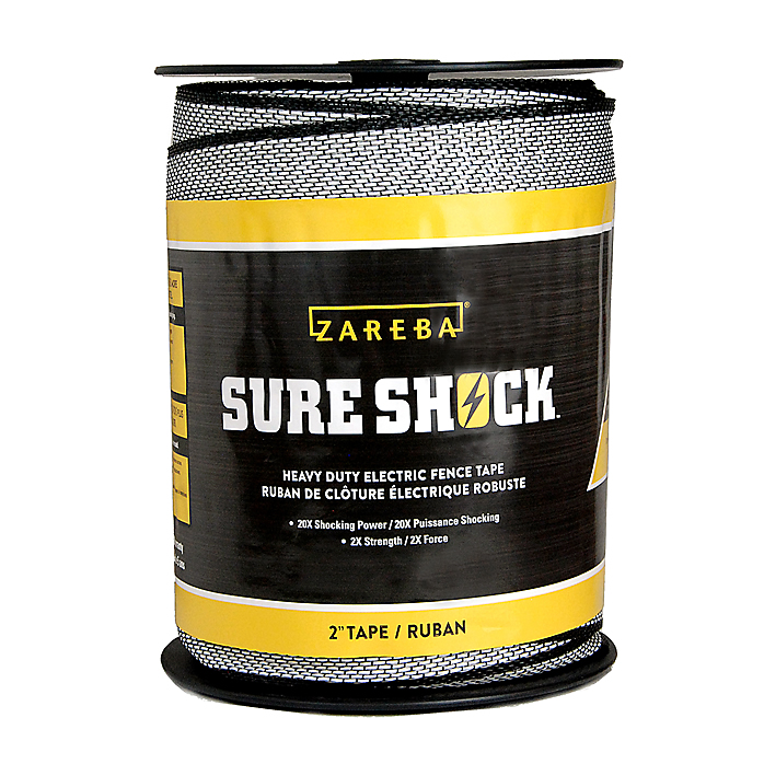 Featuring a 1,000 lb breaking strength, heavy-duty Sure Shock electric fence tape from Zareba is ideal for containing your horses, cattle and pigs inside interior paddocks. This 2-inch electric fencing features 14 highly conductive aluminum strands that deliver 20x the shocking power to any animal that challenges it. Each reel carries 500 feet of the 2-inch fiberglass fencing, which is manufactured with a PVC coating and lock-stitched edges.